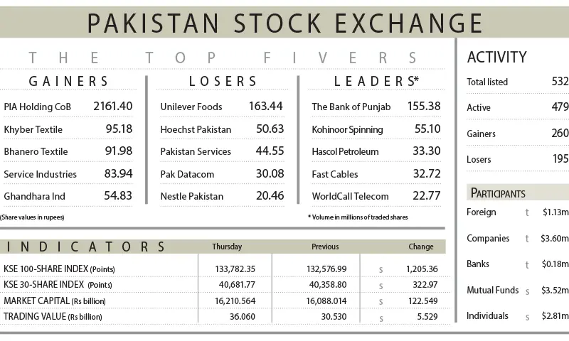 Trading activity remained robust, with 940 million shares changing hands and total turnover recorded at Rs36bn. The Bank of Punjab led the volumes with 155.3 million shares traded.
